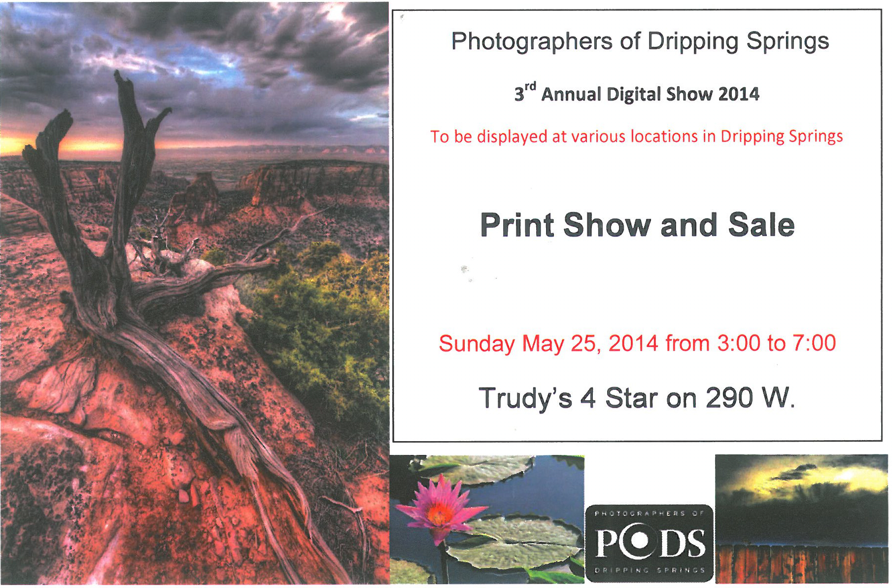 The 3rd Annual Photographers of Dripping Springs Digital and Print/Show and Sale will be in May. The Digital Show will be in various locations in the Dripping Springs area – to be announced soon.